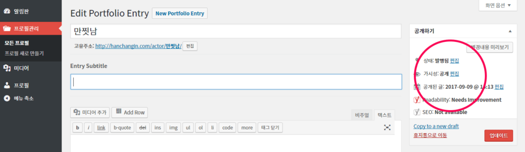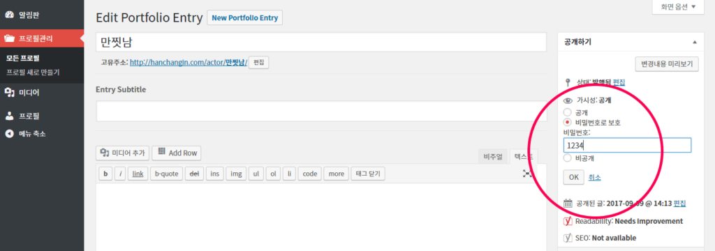 • 프로필 편집시 왼쪽에 [공개하기]탭 쪽을 보면 가시성:공개[편집]이런 식으로 되어 있는 부분이 있습니다. 여기에서 [편집]을 클릭하면 몇가지 옵션이 나타납니다. 여기에서 [비밀번호로 보호]를 체크하고 입력란에 비밀번호를 입력한 후 [ok]버튼을 클릭하면 됩니다.